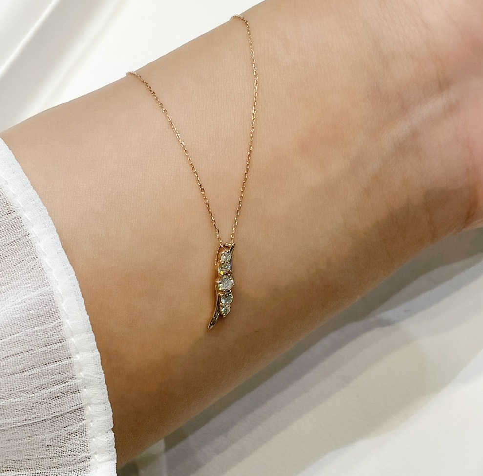 それぞれのゴールドの縁取りがダイヤモンドの存在感を際立たせ、シンプルなデザインながらも胸元を明るく演出します。