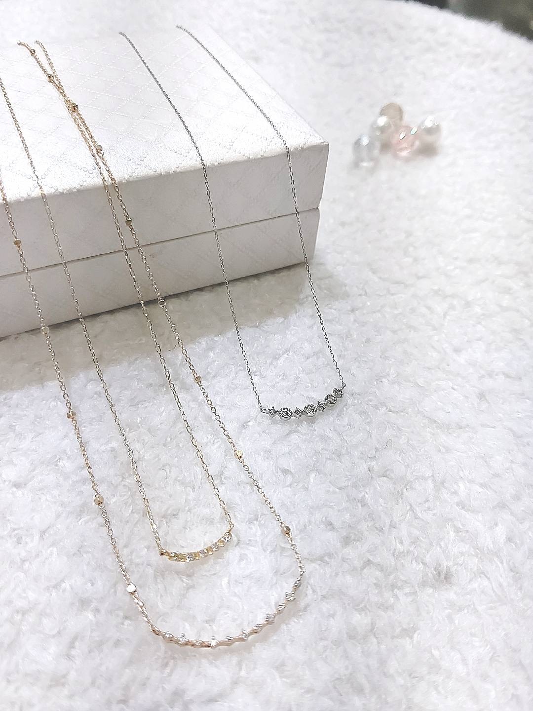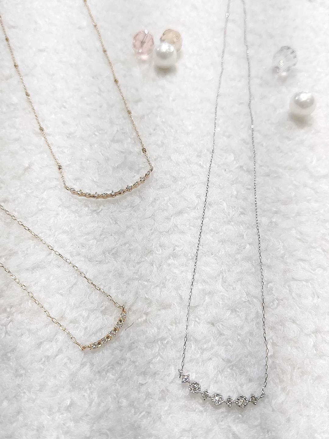 バーの地金に小さなダイヤモンド💎がそれぞれに煌めくネックレスになっており、繊細ながらも首周りを彩るラグジュアリーなジュエリー💎💕
