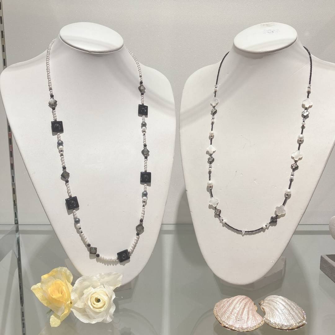 色石タイプや地金のみのタイプ、パールタイプなど様々なロングネックレスがございますので、お客様にピッタリなロングネックレスを見つけるお手伝いをぜひ私たちにさせてください❤️